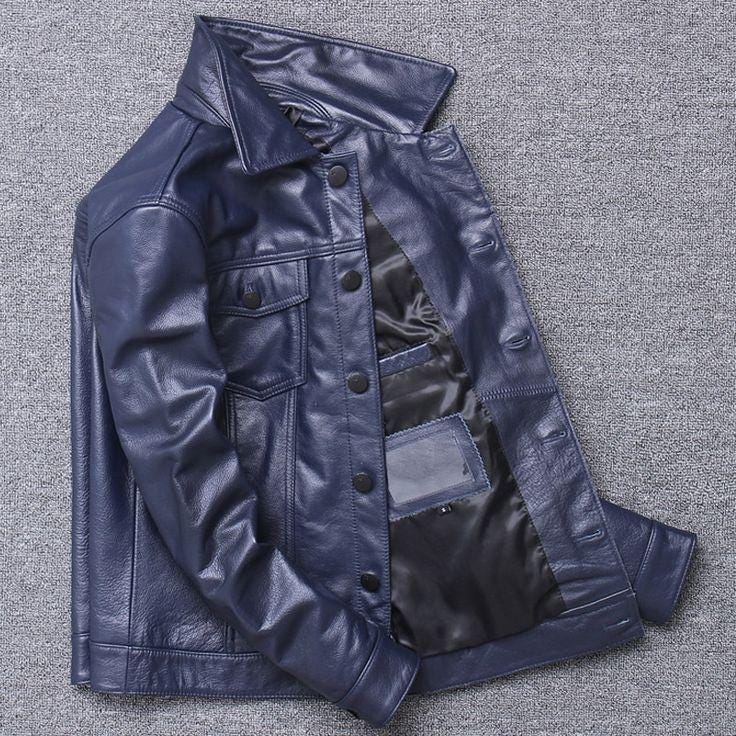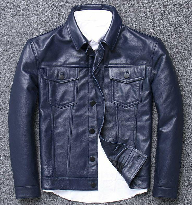 This men’s navy blue leather jacket combines timeless elegance with a modern, casual look. Inspired by a classic trucker jacket design, it features a button-up front, clean lines, and a structured yet comfortable fit—perfect for everyday wear.