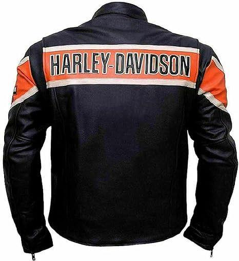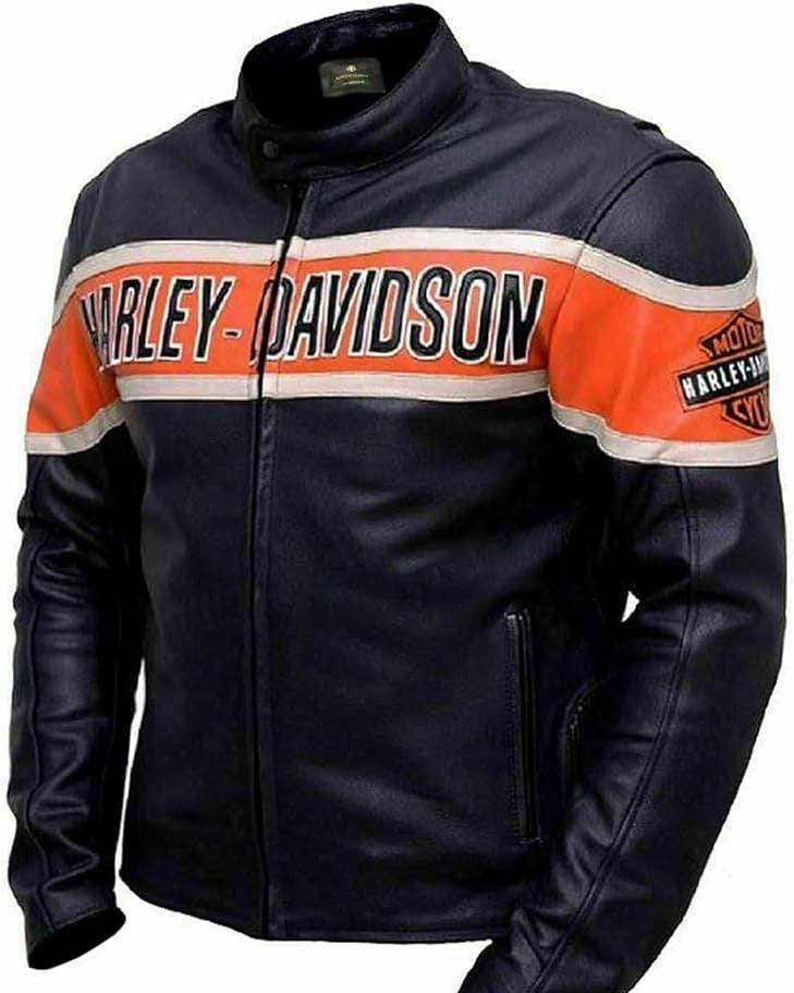 Ride in legendary style with this Harley-Davidson leather motorcycle jacket, designed for riders who appreciate classic heritage and premium craftsmanship. Made from high-quality genuine leather, this jacket features a bold black and orange vintage racing stripe across the chest with iconic Harley-Davidson branding for an authentic biker look.