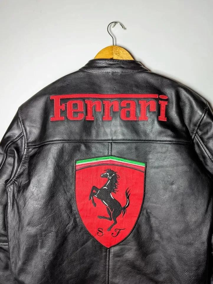 Step into classic motorsport heritage with this black leather racing jacket, inspired by iconic Ferrari racing style. Designed for riders and collectors alike, this jacket blends vintage motorsport aesthetics with modern comfort and durability. The bold red detailing, racing graphics, and premium leather construction make it a standout piece for any biker or fashion enthusiast.