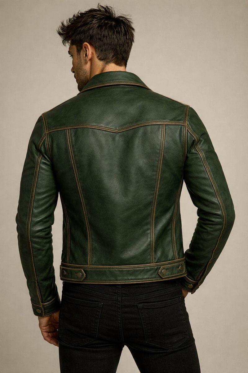 Make a bold statement with this handcrafted vintage green leather trucker jacket, designed for men who appreciate timeless style, premium materials, and expert craftsmanship. Inspired by classic retro silhouettes, this jacket blends rugged character with a refined, modern slim fit.