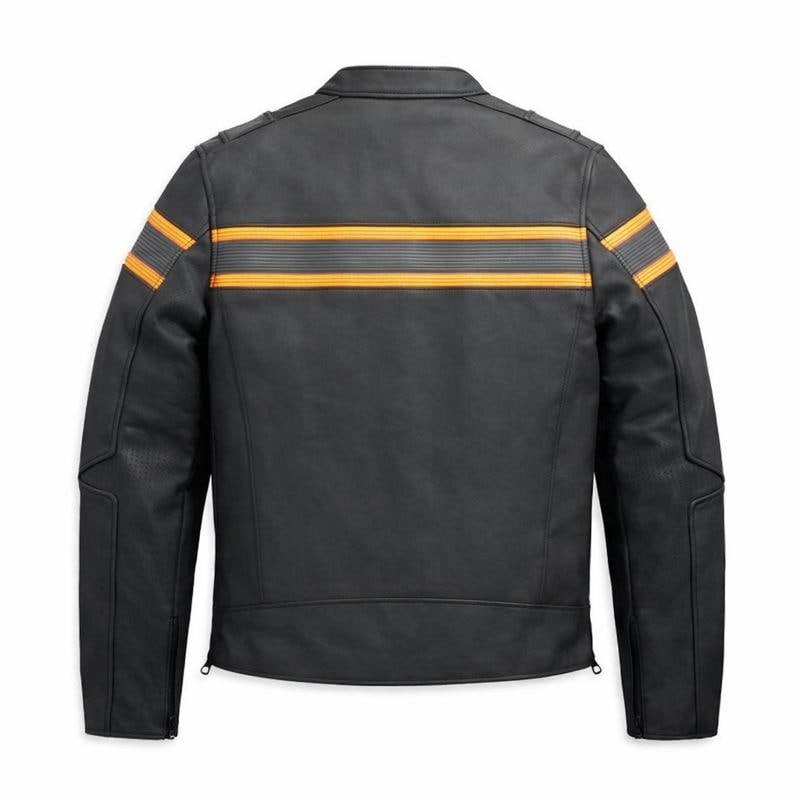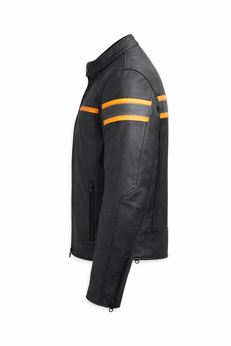 ✔ Premium quality leather exterior ✔ Classic biker & motorcycle style ✔ Breathable mesh lining for airflow ✔ Front zip closure with stand-up collar ✔ Zippered cuffs for adjustable fit ✔ Functional inner & outer pockets ✔ Striped sleeve design for a sporty look